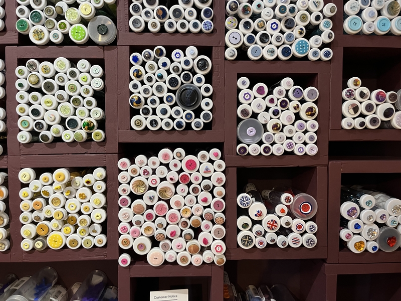最初にエレベーターで最上階まで上がり、階段を降りながら見ていきます。生地見本から端切れ、文具まで、色の洪水で埋め尽くされているよう。食器類も充実していて、チューダー様式の建物の雰囲気に、とてもあっていました。