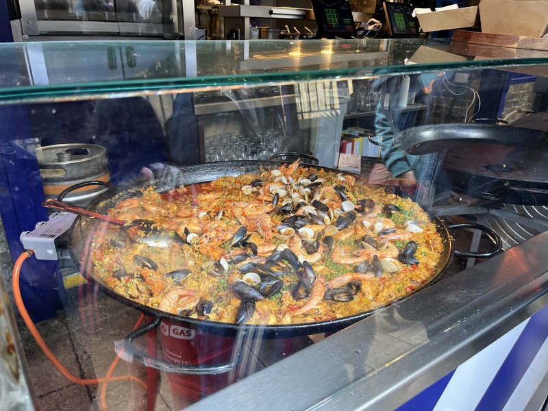 早めのランチにお伺いしましたが、子連れでもあり、まずはマーケットの外れにある座って食べられるパエリア店へ(一番有名なところとは別です)。ちょっとポルトガル風というのか、水分多めで、これはこれで旨みたっぷりで美味しい!チキンバーガーもしっかりしたバンズとチキンがよく合いました。