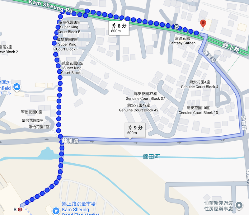 MTR「錦上路」のB出口を出ると左前に川があり、そこを渡ってまっすぐ歩きます。最初の信号のある交差点で右に曲がるとお店です!