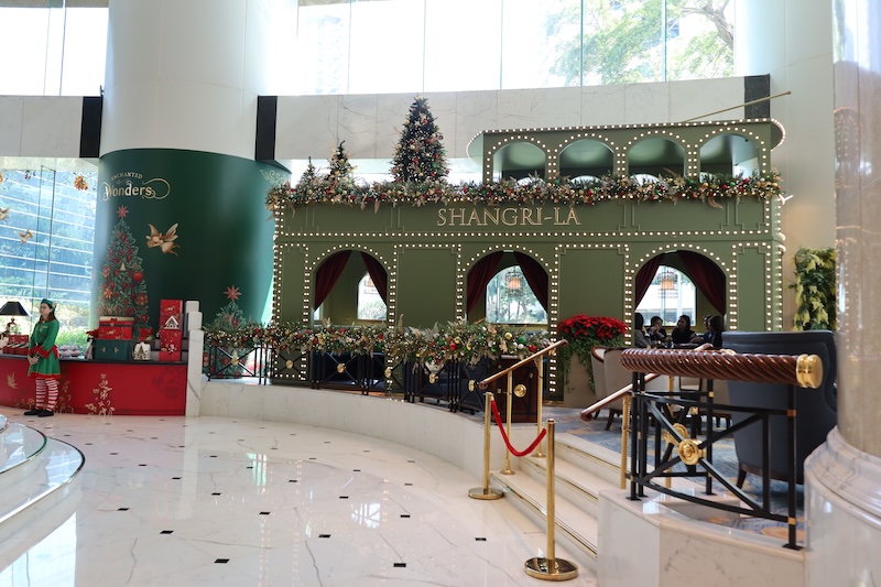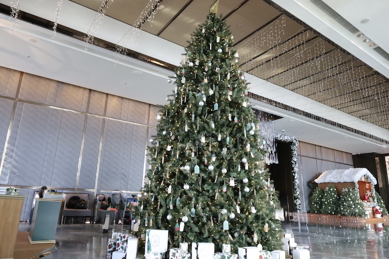 毎年、豪華なシャンデリアの下に立派なツリーが出るアイランド・シャングリラ。