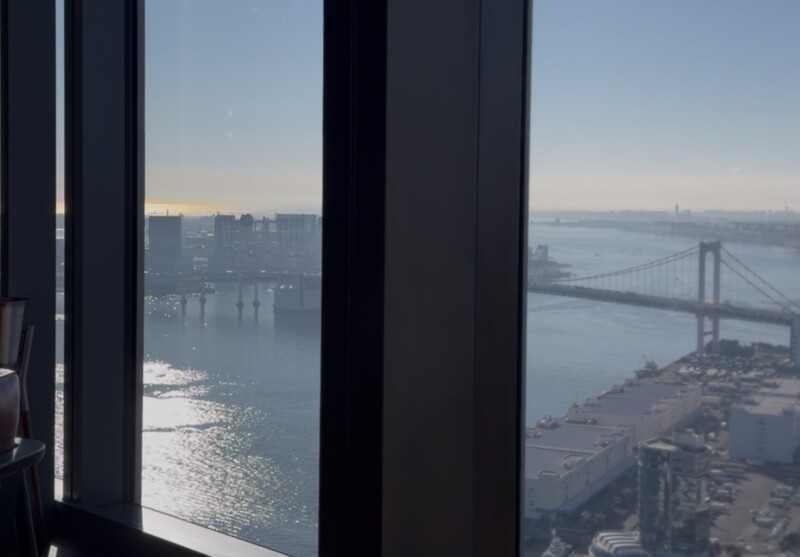 昨年2025年にOPENした当初はオペレーションが混乱していたようで、朝食8,500円という強気なお値段もあり、ネット上では酷評が目立ったのですが、結論から言うと、日常を忘れる空間が広がっていました!なんと言っても、レインボーブリッジと東京湾を眼下に臨む絶景は唯一無二で、実際の35階という階数より高く感じられます。