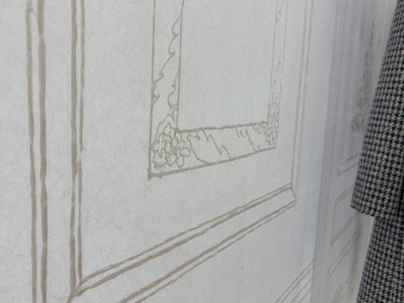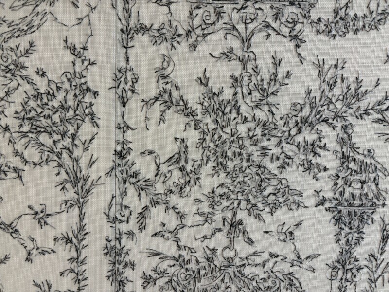 フィッティングルームの壁一面に、一筆書きの刺繍で描かれた「トワル ド ジュイ」(by光井花)