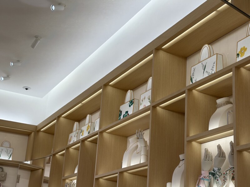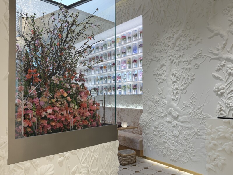 ショップに併設されているカフェ ディオールでは、東信による「パルダリウム」と「ブロックフラワー」が入り口を彩り、天井には、柴田あゆみの切り絵による紙の花々があしらわれています。